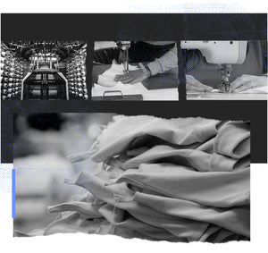 It starts with yarn that gets milled and knitted into high quality fabric in local facilities. Then this fabric gets cut based on a pattern. The pattern pieces are sewn together creating a functional garment.